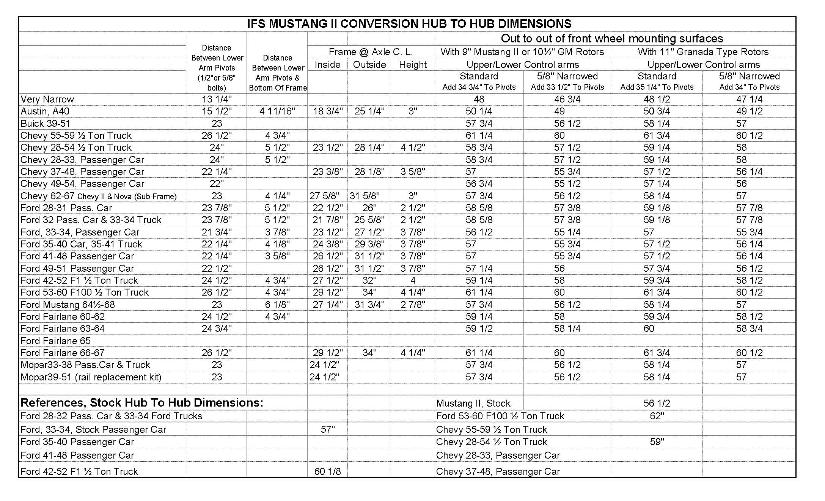HUB TO HUB DIMENSION The Hub to Hub dimension (out to out of wheel mounting surfaces) needs to be taken into consideration when ordering the conversion kit. When the distance inside the fenders is quite narrow, 5/8" narrowed upper & lower arms may be needed. The upper & lower arms MUST match. If needed the Hub to Hub distance with 10.5" or 9" rotors is 1/2" more narrow than 11" rotors. Normally yhe front Hub to Hub dimension needs to match the rear. The rear can be measured by removing the rear wheels with the vehicle on stands, dropping a plumb bob from each wheel mounting surface and measuring the distance between the tips of the plumb bob.